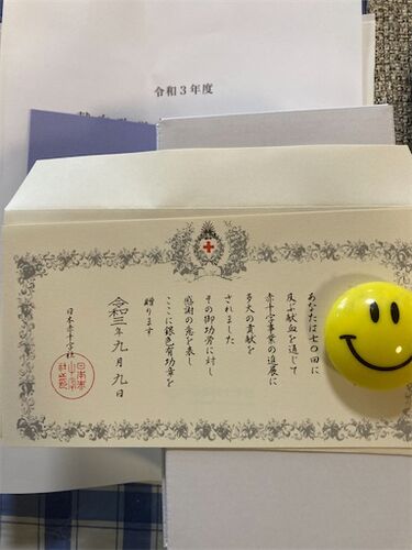 夏休みシリーズは今日はお休み。さて献血70回を達成したので、記念品が届いた。表彰状とグラス。 コロナ禍のため式典は中止となったが、やはり表彰状もらうと嬉しいものだなあと。ミニサイズなので冷蔵庫に貼ってます。