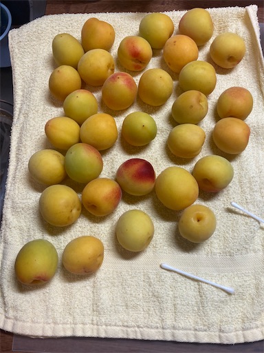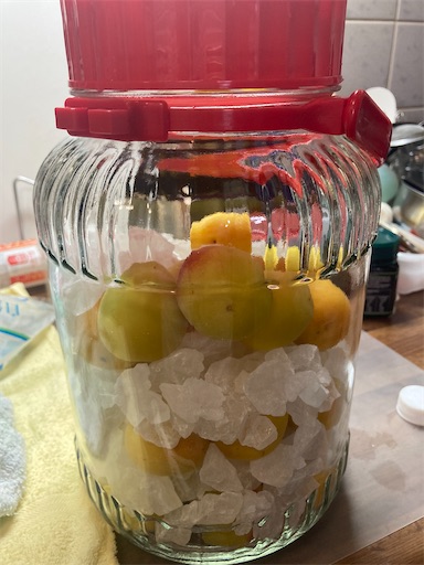 2022-06-18 梅シロップにチャレンジ 日々のいろいろ 飲み食い 立ち寄ったスーパーで 「今シーズン最後の入荷です!」 という文句に惹かれて買った梅1kg。前から気にはなっていたものの、ずっとチャレンジしなかった梅シロップを作ることにした。酢を入れる方法もあるんだね。さてどうなるかな。
